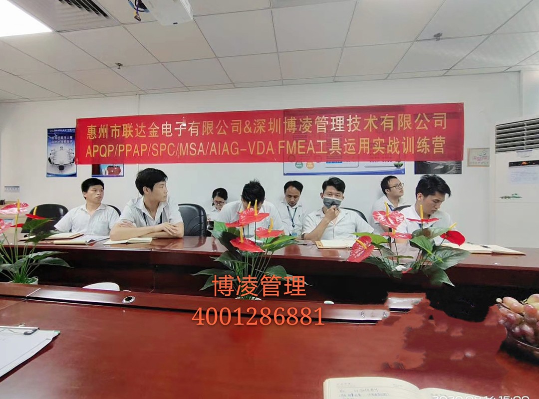 博凌管理團隊為惠州市聯達金電子有限公司進行五大工具及新版AIAG-VDA    FMEA培訓。以質量策劃(APQP)實施為主線,結合具體產品,詳細講解新產品導入過程中所需的知識和技能,并通過練習使學員能靈活運用FMEA、DVP&R、SPC、MSA、控制計劃等工具;研討企業現有工具在應用過程中存在的問題,進而找到改進的方法。根據最新發布的AIAG-VDA FMEA要求,系統的講解新版FMEA的背景,重要變化點及企業如何應對等,并針對性極強地講解DFMEA、PFMEA和 FMEA-MSR的內容、要求、內部邏輯、實施步驟和方法,幫助企業相關職能部門負責人及主管工程師們能夠快速聚焦變更,透徹理解OEM對潛在失效分析并進行預防,解決產品設計和過程設計可能出現的問題。